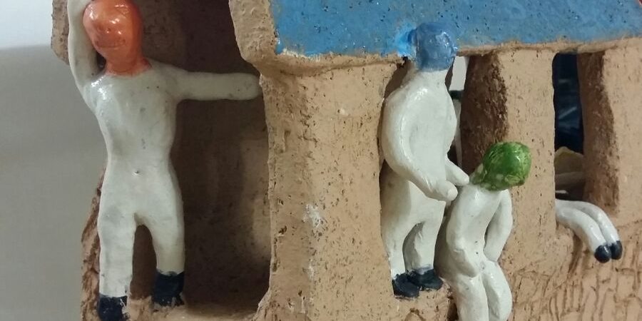 Deutsche und syrische Kinder und Jugendliche aus dem Forum Kunst haben unter der Leitung von Regine Autenrieth ihre alte und neue Heimat gestaltet und in Ton plastiziert. Die Stadtmauer in Münsingen wurde als Gemeinschaftsarbeit  in Form einer großen Skulptur erschaffen. Dabei treffen Gegensätze wie Tradition und Moderne, Brauchtum und Wahrzeichen, Irritation und Provokation beider Kulturen aufeinander. Im Kontext der figuralen Darstellung der Personen entsteht zum einen, die Gleichheit in der Formgebung, zum anderen die Freiheit der Individien, der in verschiedenen Farben sichtbar gestalteten Köpfe. Das Dach zum Himmel in der Farbe blau, steht symbolisch für die Weite des Geistes, für die Öffnung und Toleranz im Miteinander. In Einzelwerken, auf denen die persönlichen Geschichten der Jugendlichen, sowie Mischwesen aus Urzeiten der Schwäbischen Heimat dargestellt sind, finden Gedanken, Wünsche, Erinnerungen und Träume ihren Raum und erzählen: Sichtweisen auf meine Heimat.